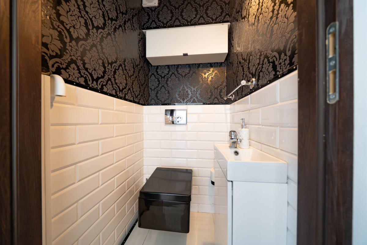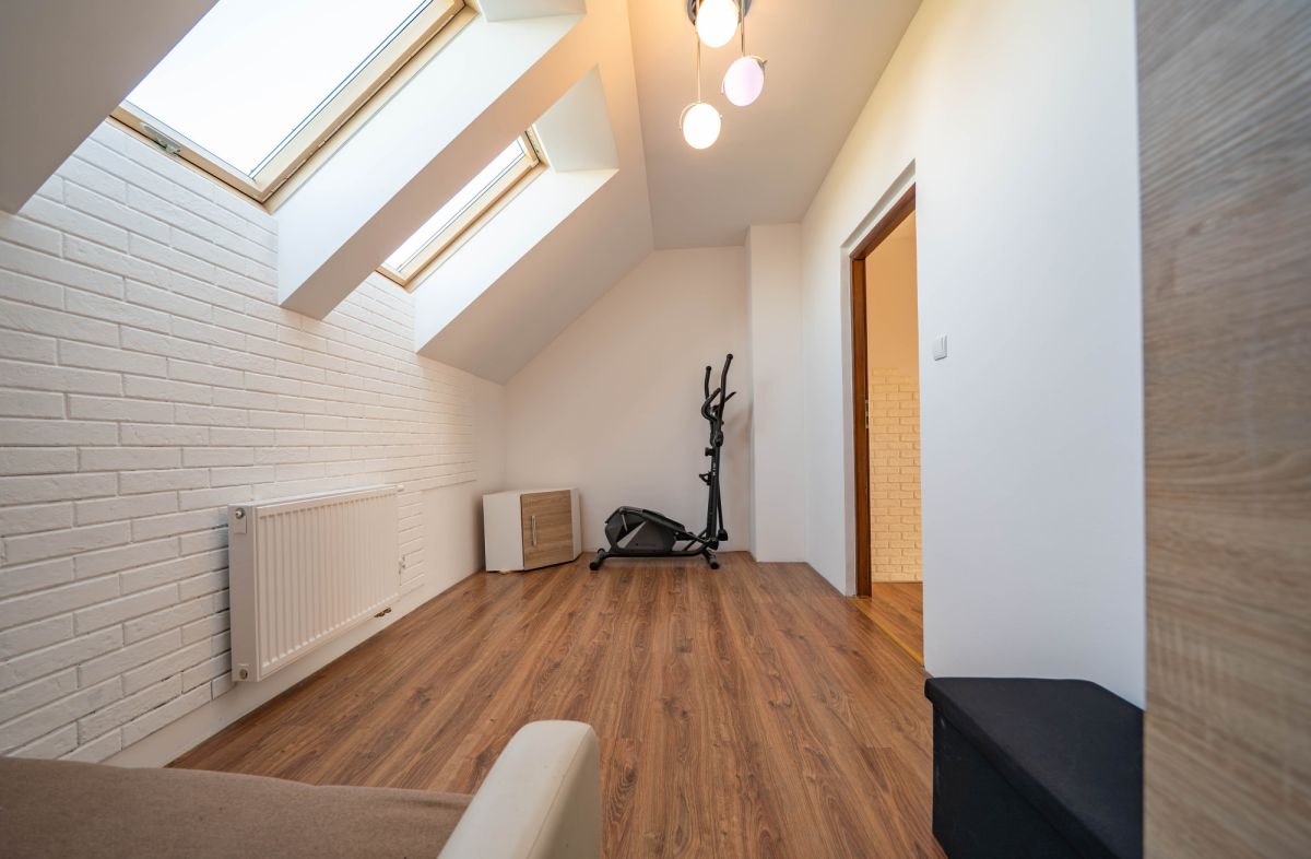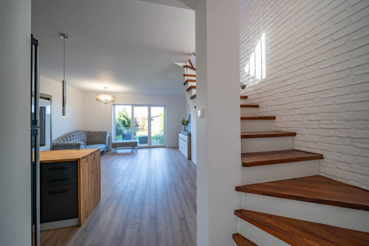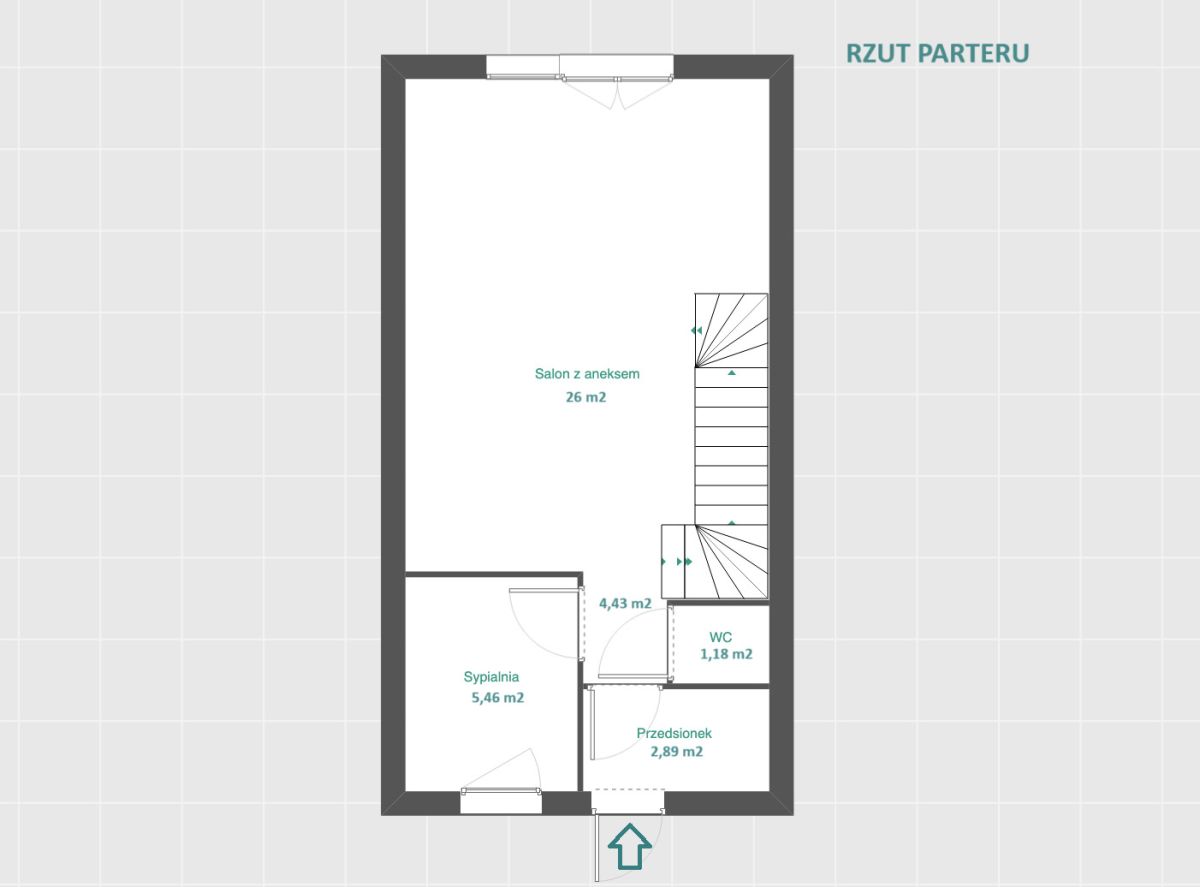 Na parterze mieści się przytulny salon z aneksem kuchennym, WC oraz niewielkie pomieszczenie idealne jako gabinet lub pracownia.