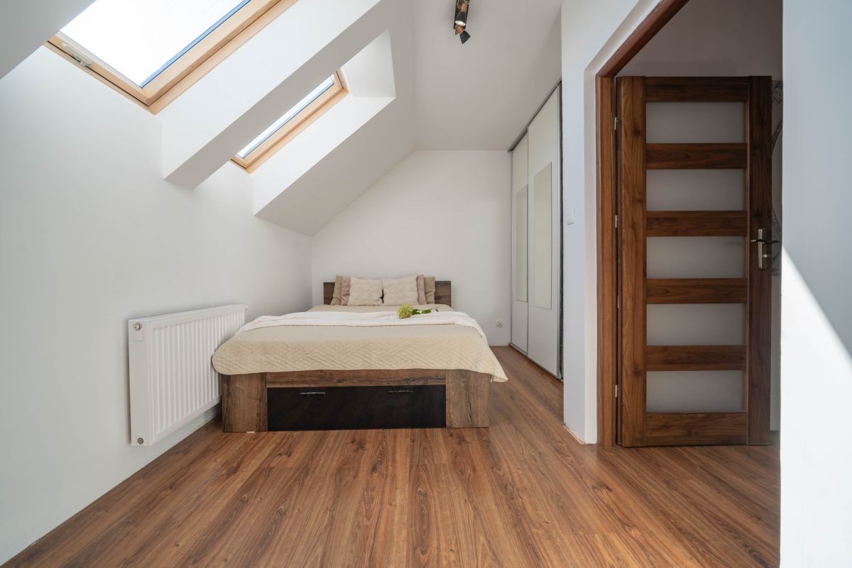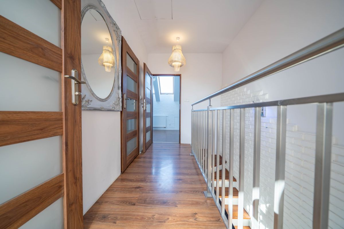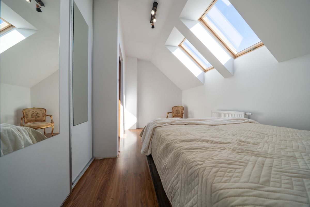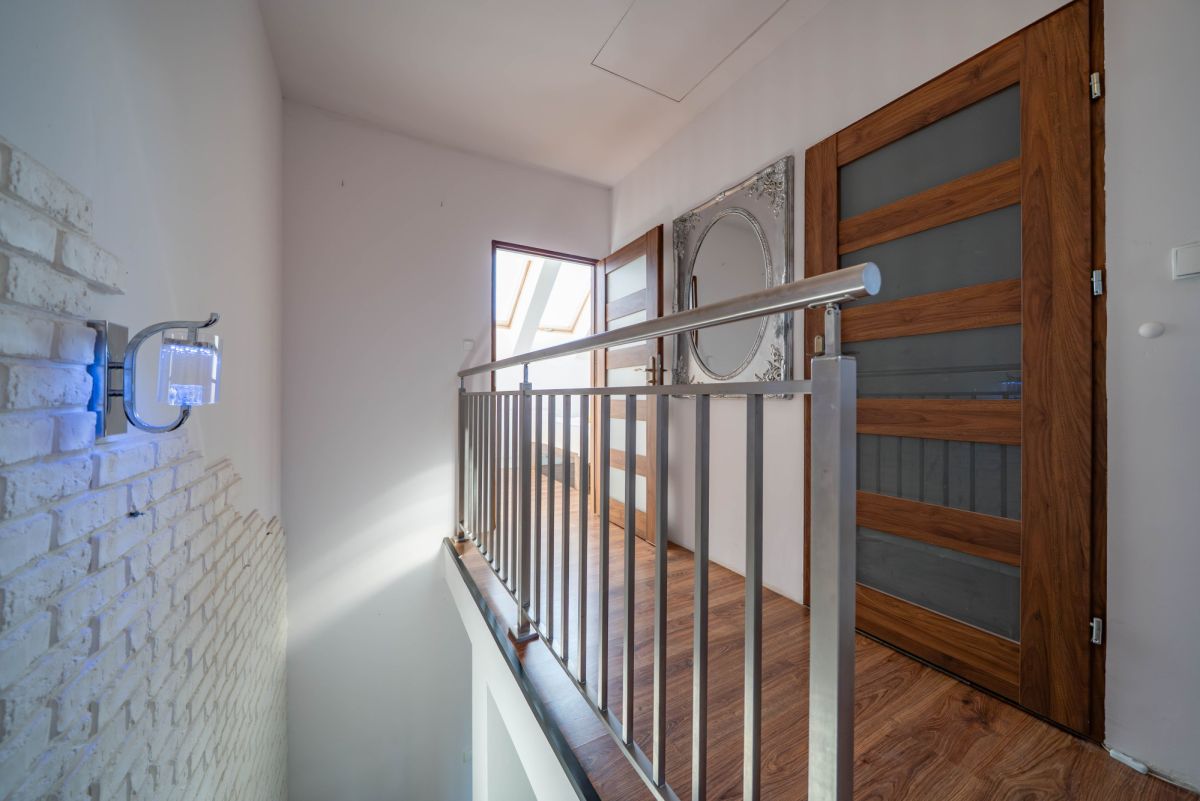 Na piętrze znajdziemy 2 ustawne sypialnie oraz dużą łazienkę z wanną.