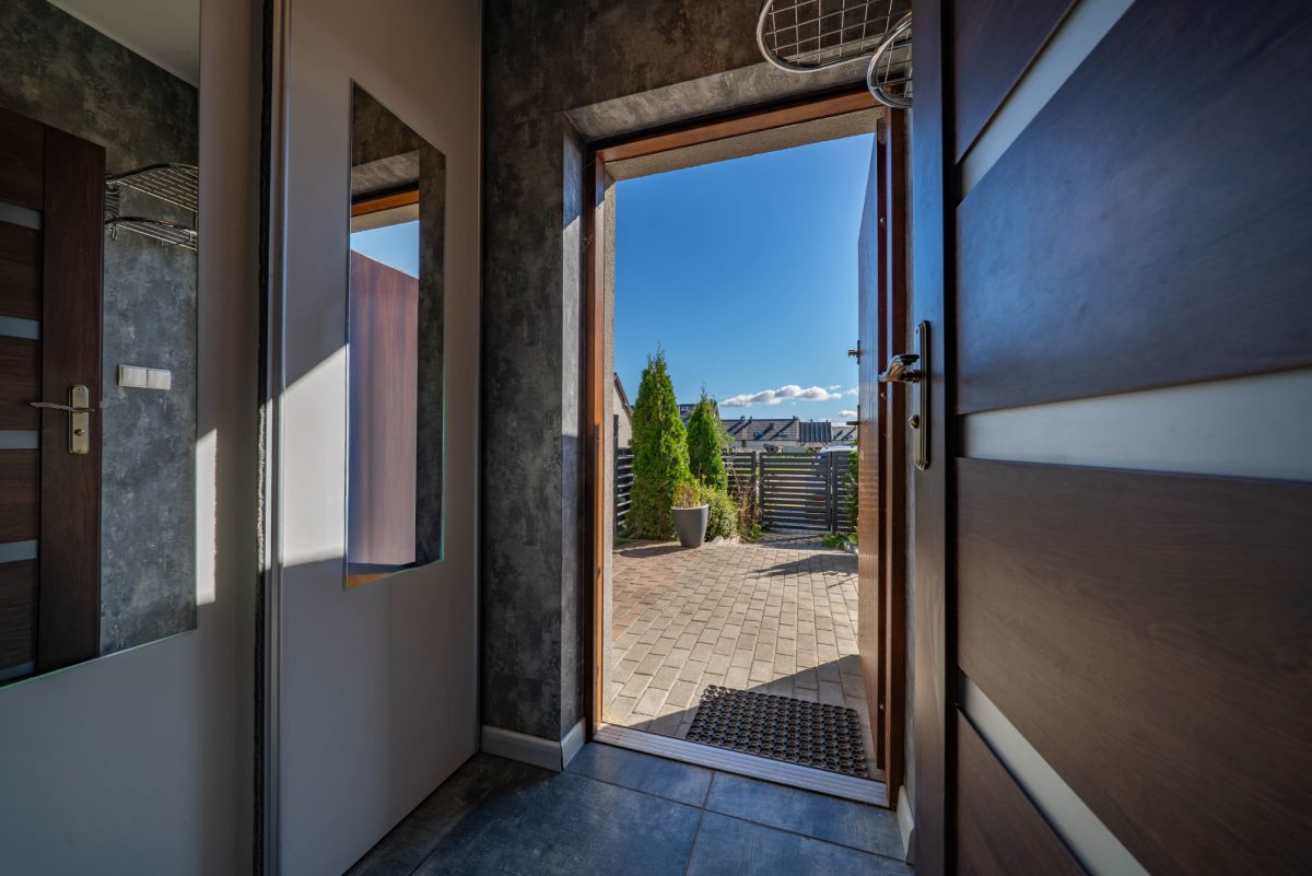Z salonu wyjście przez taras do bardzo kameralnego ogródka z domkiem na narzędzia i sprzęty do pielęgnacji ogrodu.
