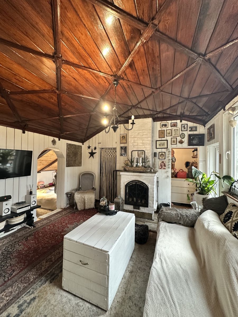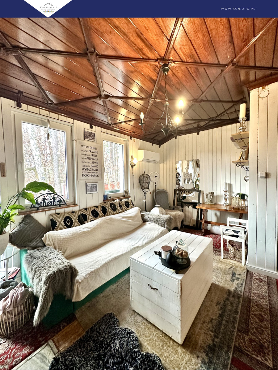 Przytulny, rustykalny domek o powierzchni użytkowej 80 m² łączy w sobie drewnianą starszą cześć domu oraz nowszą murowaną. Na parterze znajdziesz przytulny salon z kominkiem oraz sypialnię, a także funkcjonalną garderobę. Część murowana to kuchnia z kozą, łazienka oraz dodatkowy, przestronny pokój na piętrze. W kuchni podłoga wykończona granitem, co jest spójne z charakterem domu, a w salonie - zabytkowy piękny drewniany sufit (ma około 120 lat, przeniesiony z zabytkowej kamienicy w Sopocie), co nadaje miejscu niepowtarzalny charakter.