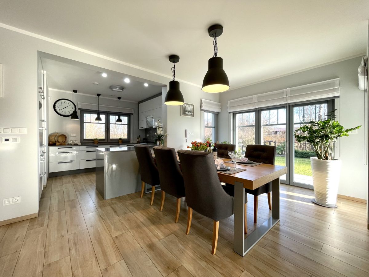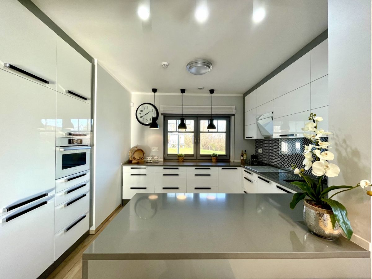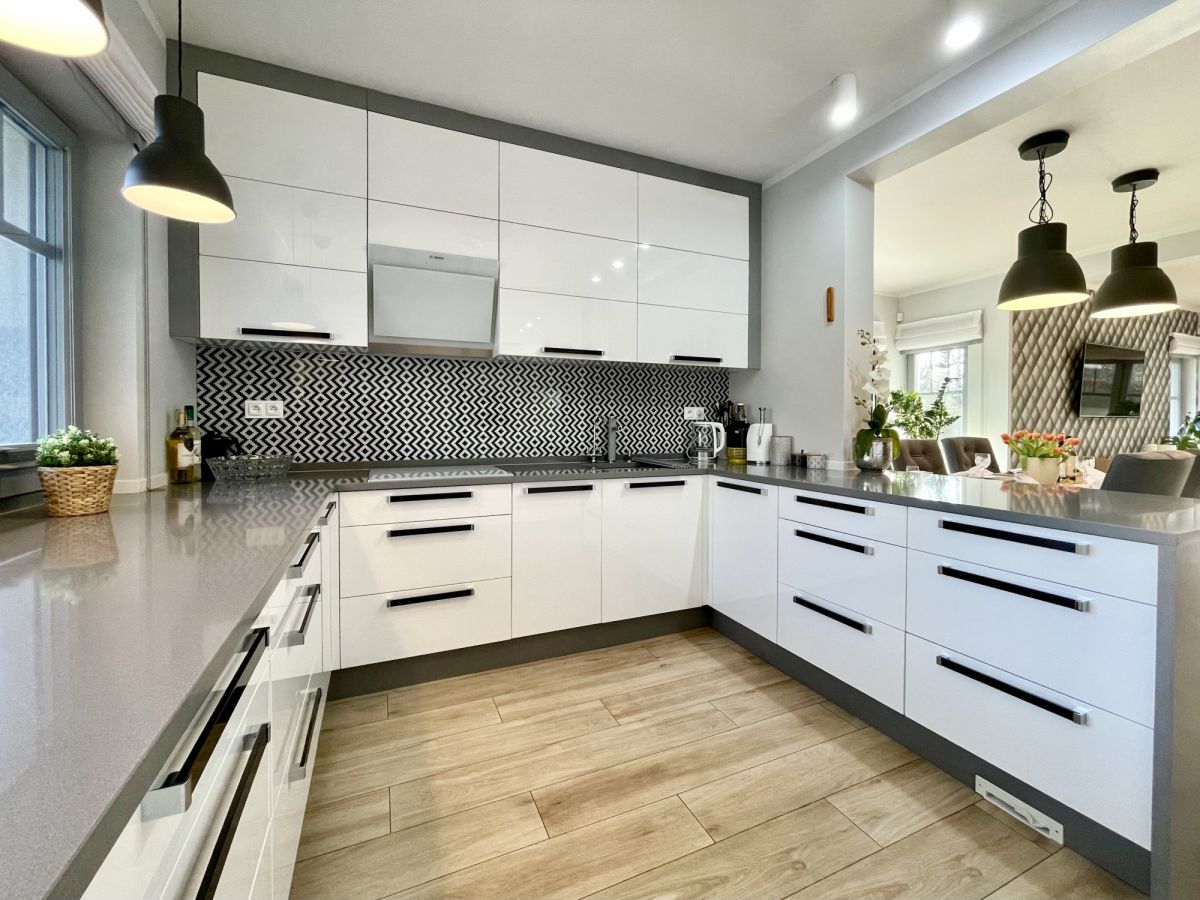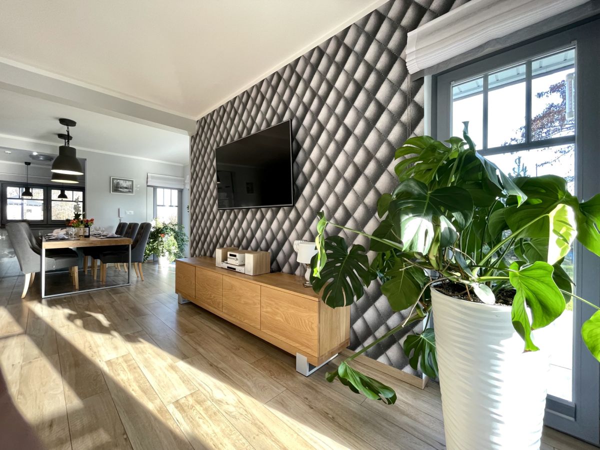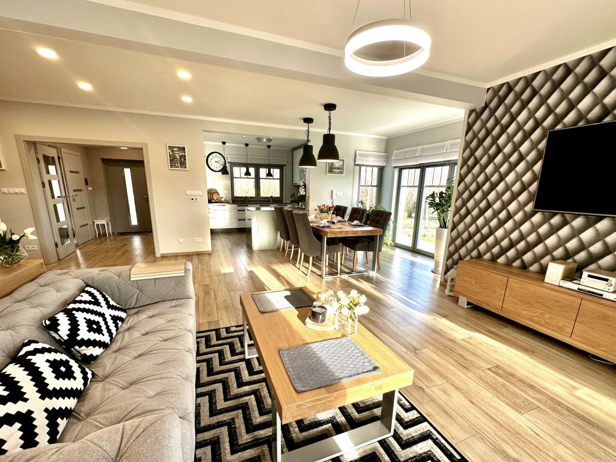 W kuchni (11 m²) zainstalowano nowoczesne, białe szafki, które harmonijnie tworzą jednolitą ścianę. Fronty mebli w bieli zostały ozdobione eleganckimi, szarymi blatami granitowymi, kontrastującymi z czarnymi lampami i kafelkami o drobnych, czarno-białych wzorach. Elementy dekoracyjne w kuchni doskonale komponują się z wzorem występującym w salonie, co tworzy jednolitą i harmonijną estetykę całego wnętrza. W kuchni znajduje się również wysokiej klasy AGD Bosch (okap, piekarnik z funkcją mikrofalówki, płyta indukcyjna) w kolorze białym oraz zabudowana zmywarka. Podczas gotowania będziesz uczestniczyć w życiu rodzinnym i towarzyskim, ponieważ kuchnia jest połączona z wygodną jadalnią w której znajduje się duży drewniany stół z wygodnymi fotelami które pozwolą na wielogodzinne spędzanie czasu z rodziną bądź znajomymi. Życie rodzinne może toczyć się również w przestronnym salonie w którym stworzono przytulny kącik telewizyjny z wygodną sofą oraz elegancką konsolą nadającą pomieszczeniu charakter. W salonie możesz zasiąść z ulubioną książką na wygodnym fotelu przy kominku. Dzięki wielu oknom i korzystnej orientacji budynku, przestrzeń dzienna jest niezwykle jasna i pełna naturalnego światła słonecznego. W przypadku potrzeby skupienia lub pracy przy komputerze, każde okno zostało wyposażone w rolety rzymskie, umożliwiające regulację światła i zachowanie prywatności.