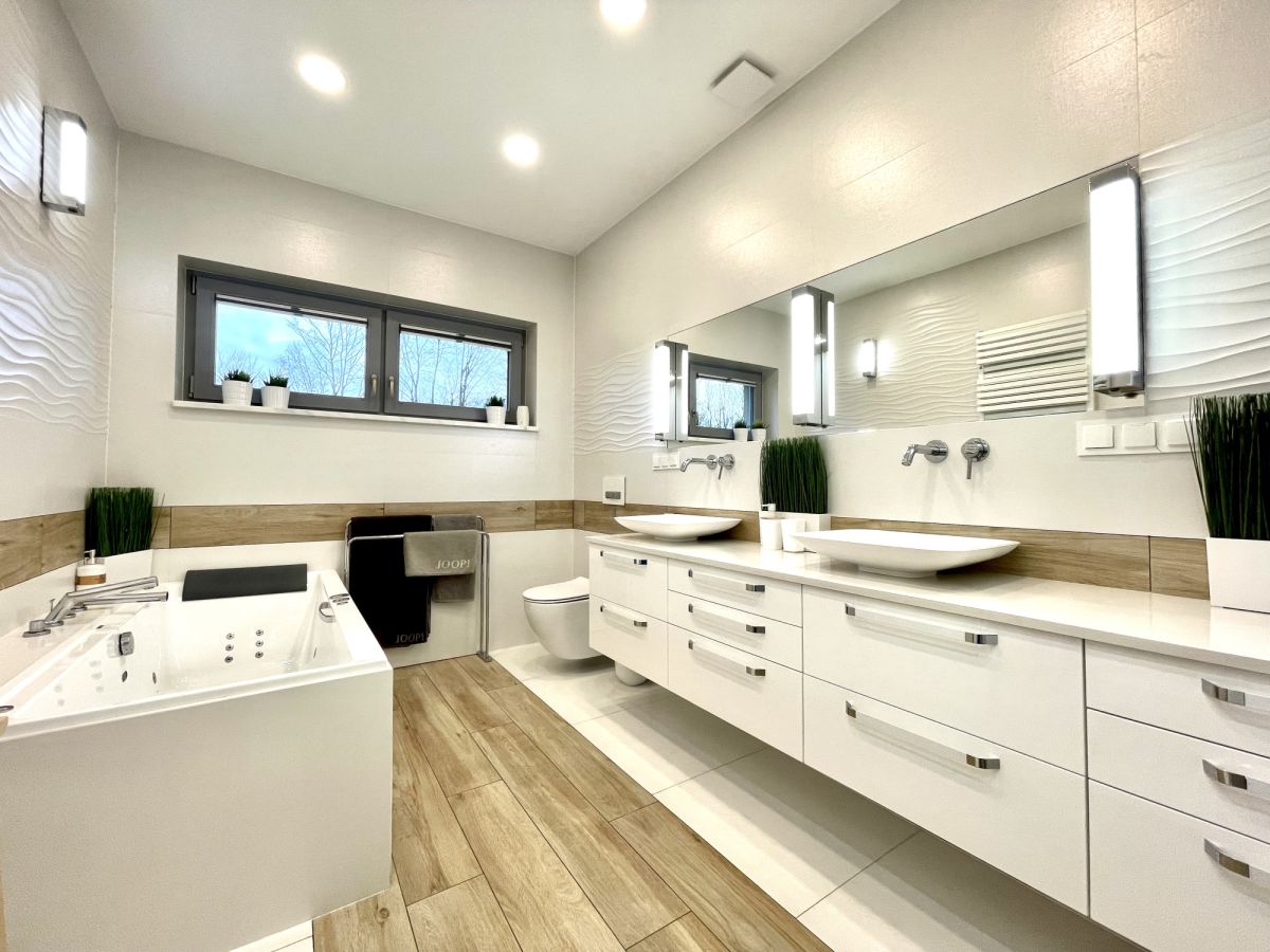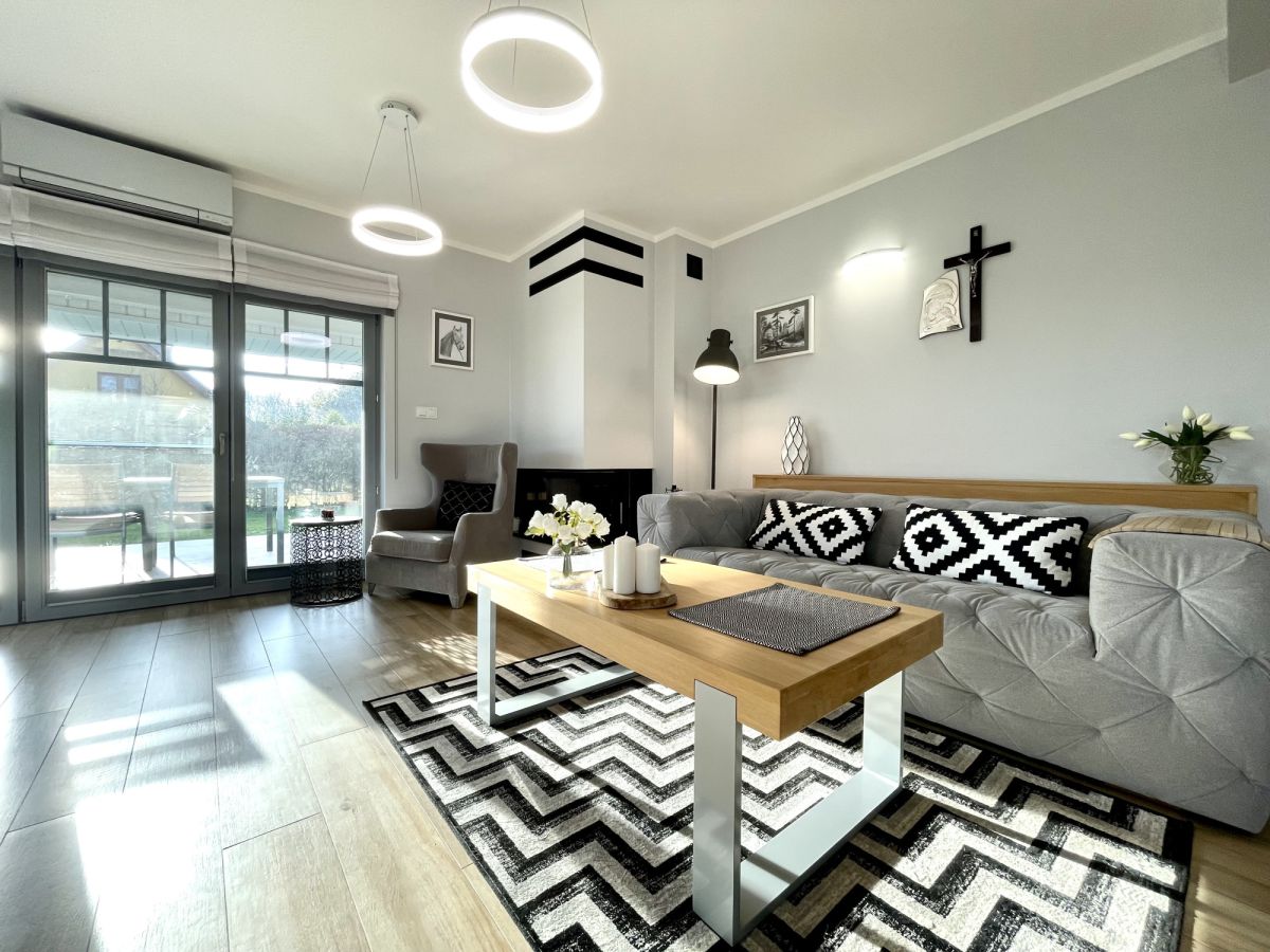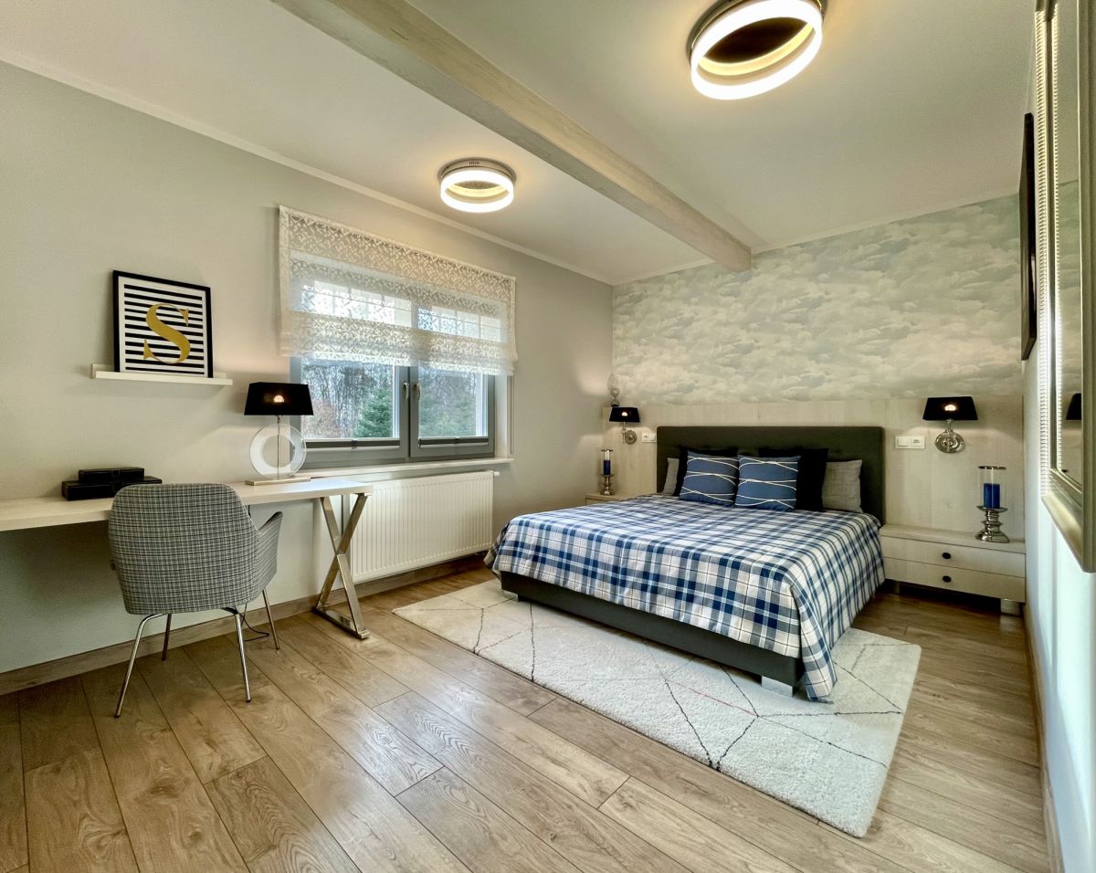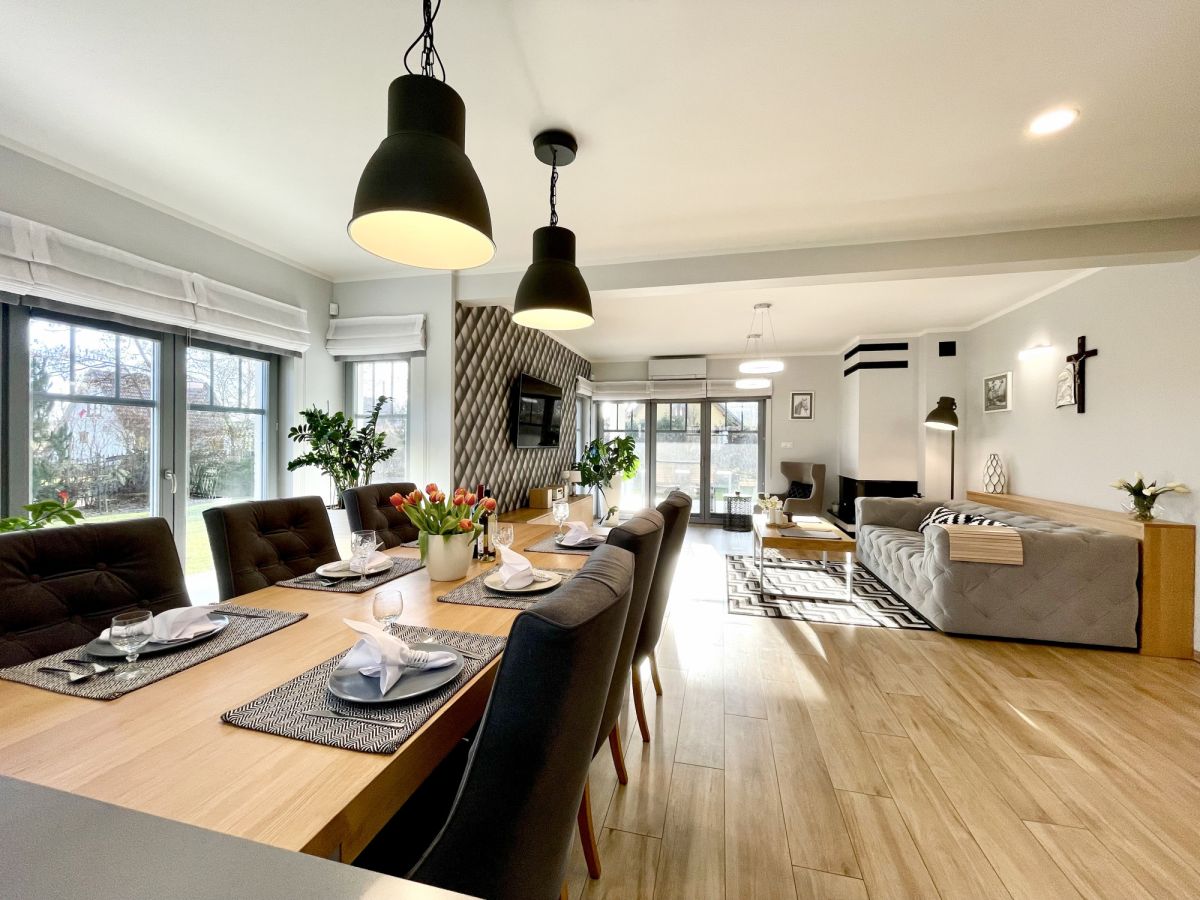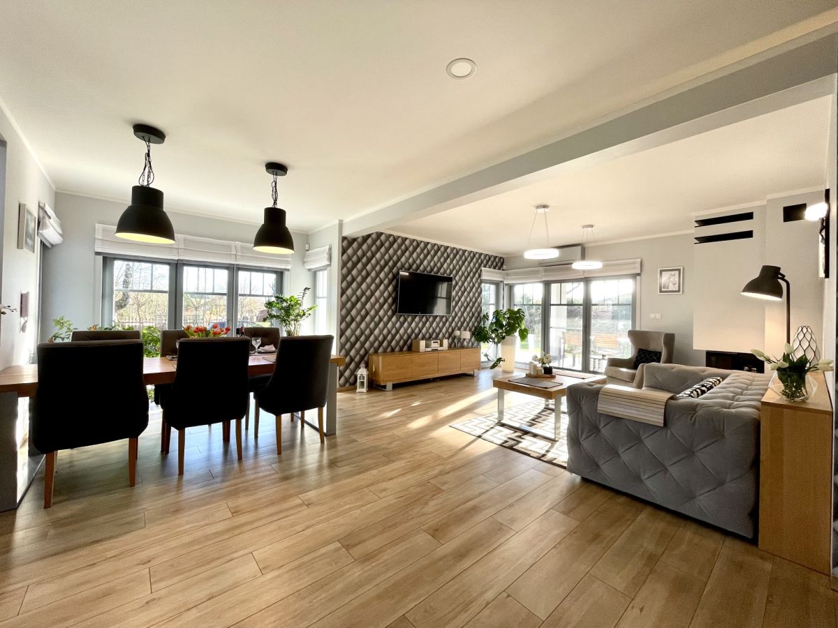 W kuchni (11 m²) zainstalowano nowoczesne, białe szafki, które harmonijnie tworzą jednolitą ścianę. Fronty mebli w bieli zostały ozdobione eleganckimi, szarymi blatami granitowymi, kontrastującymi z czarnymi lampami i kafelkami o drobnych, czarno-białych wzorach. Elementy dekoracyjne w kuchni doskonale komponują się z wzorem występującym w salonie, co tworzy jednolitą i harmonijną estetykę całego wnętrza. W kuchni znajduje się również wysokiej klasy AGD Bosch (okap, piekarnik z funkcją mikrofalówki, płyta indukcyjna) w kolorze białym oraz zabudowana zmywarka. Podczas gotowania będziesz uczestniczyć w życiu rodzinnym i towarzyskim, ponieważ kuchnia jest połączona z wygodną jadalnią w której znajduje się duży drewniany stół z wygodnymi fotelami które pozwolą na wielogodzinne spędzanie czasu z rodziną bądź znajomymi. Życie rodzinne może toczyć się również w przestronnym salonie w którym stworzono przytulny kącik telewizyjny z wygodną sofą oraz elegancką konsolą nadającą pomieszczeniu charakter. W salonie możesz zasiąść z ulubioną książką na wygodnym fotelu przy kominku. Dzięki wielu oknom i korzystnej orientacji budynku, przestrzeń dzienna jest niezwykle jasna i pełna naturalnego światła słonecznego. W przypadku potrzeby skupienia lub pracy przy komputerze, każde okno zostało wyposażone w rolety rzymskie, umożliwiające regulację światła i zachowanie prywatności.