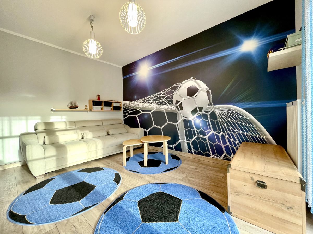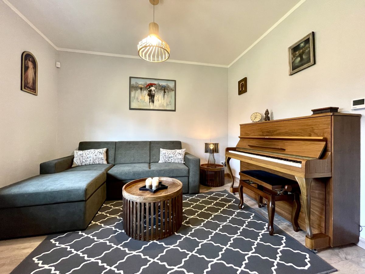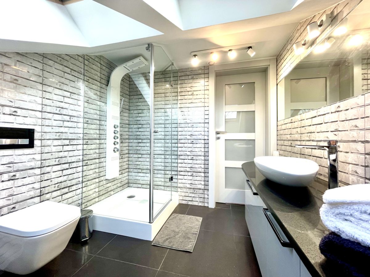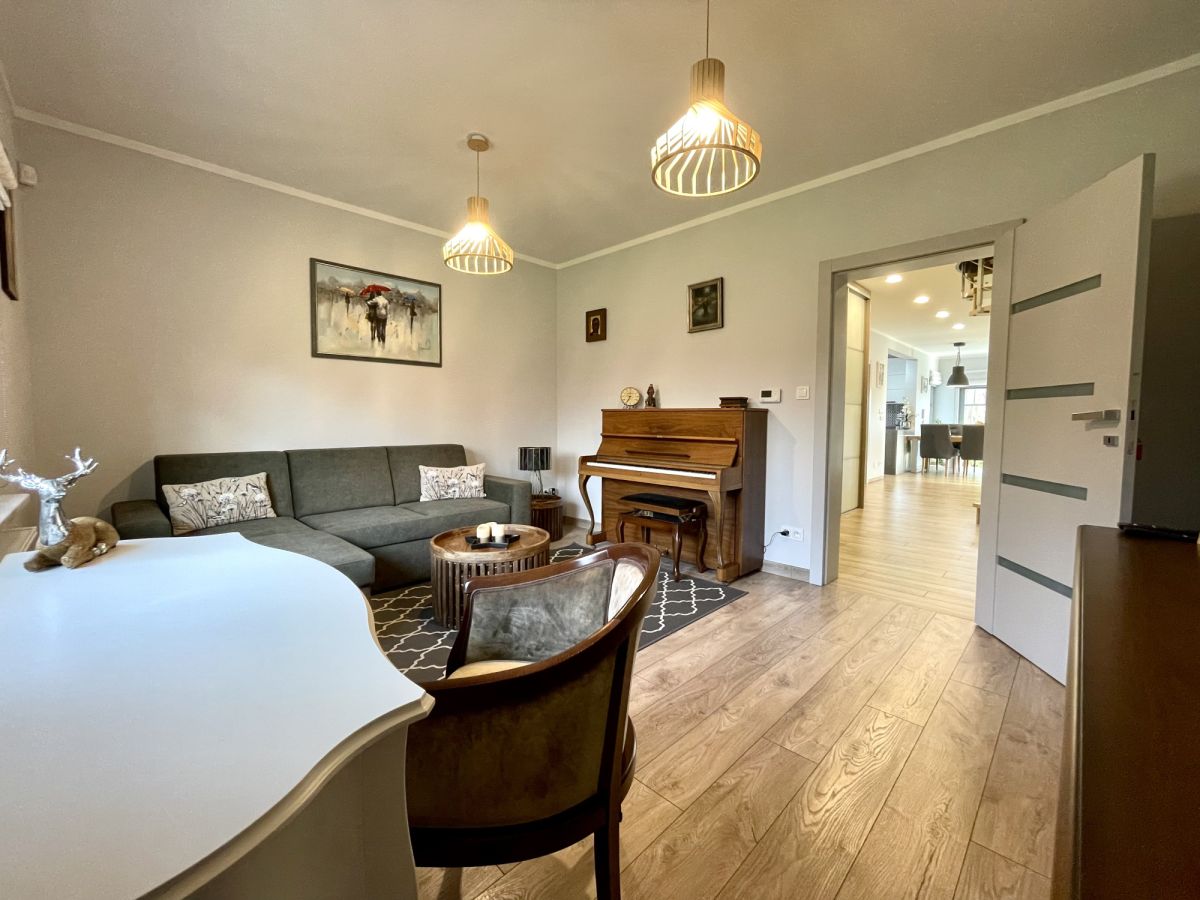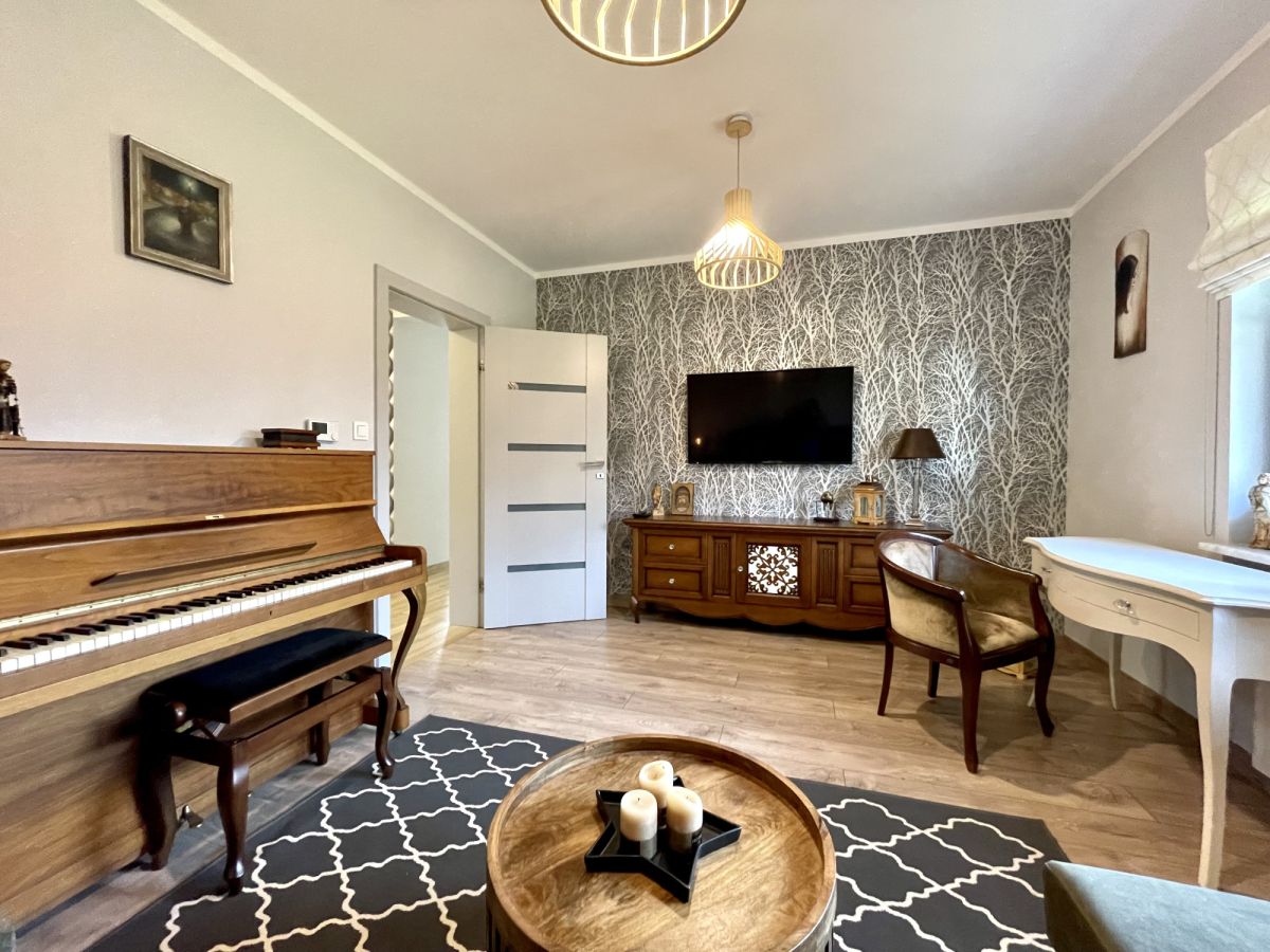 W kuchni (11 m²) zainstalowano nowoczesne, białe szafki, które harmonijnie tworzą jednolitą ścianę. Fronty mebli w bieli zostały ozdobione eleganckimi, szarymi blatami granitowymi, kontrastującymi z czarnymi lampami i kafelkami o drobnych, czarno-białych wzorach. Elementy dekoracyjne w kuchni doskonale komponują się z wzorem występującym w salonie, co tworzy jednolitą i harmonijną estetykę całego wnętrza. W kuchni znajduje się również wysokiej klasy AGD Bosch (okap, piekarnik z funkcją mikrofalówki, płyta indukcyjna) w kolorze białym oraz zabudowana zmywarka. Podczas gotowania będziesz uczestniczyć w życiu rodzinnym i towarzyskim, ponieważ kuchnia jest połączona z wygodną jadalnią w której znajduje się duży drewniany stół z wygodnymi fotelami które pozwolą na wielogodzinne spędzanie czasu z rodziną bądź znajomymi. Życie rodzinne może toczyć się również w przestronnym salonie w którym stworzono przytulny kącik telewizyjny z wygodną sofą oraz elegancką konsolą nadającą pomieszczeniu charakter. W salonie możesz zasiąść z ulubioną książką na wygodnym fotelu przy kominku. Dzięki wielu oknom i korzystnej orientacji budynku, przestrzeń dzienna jest niezwykle jasna i pełna naturalnego światła słonecznego. W przypadku potrzeby skupienia lub pracy przy komputerze, każde okno zostało wyposażone w rolety rzymskie, umożliwiające regulację światła i zachowanie prywatności.