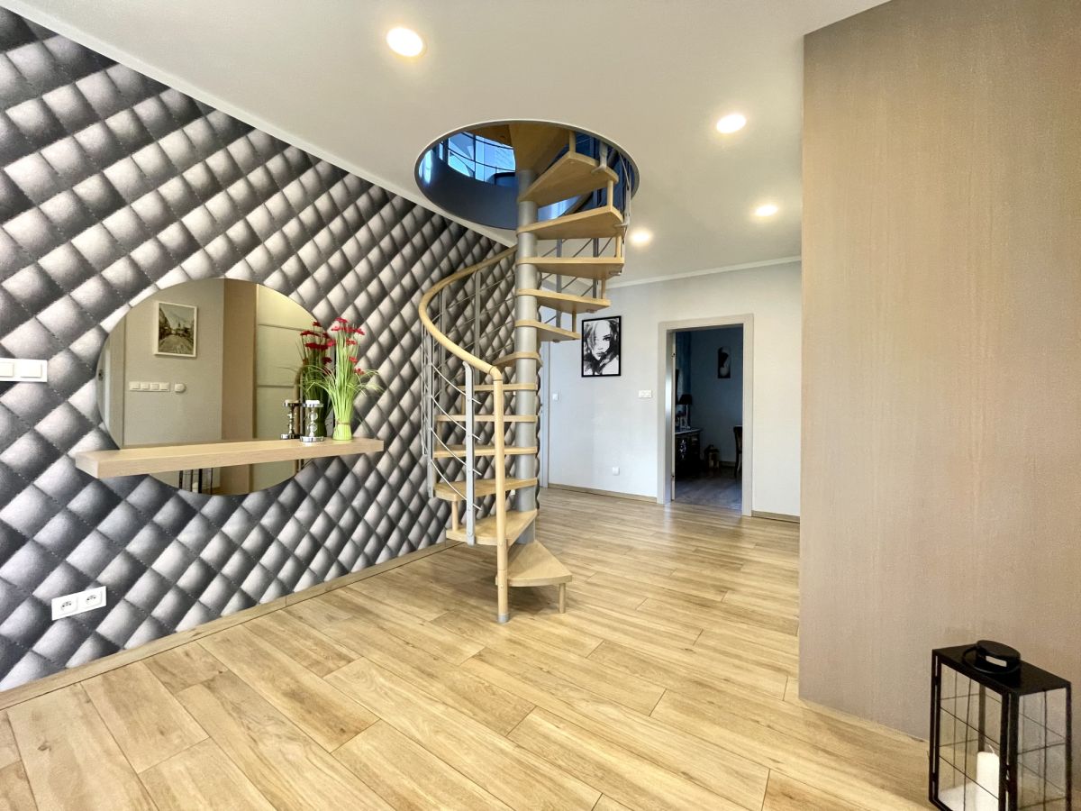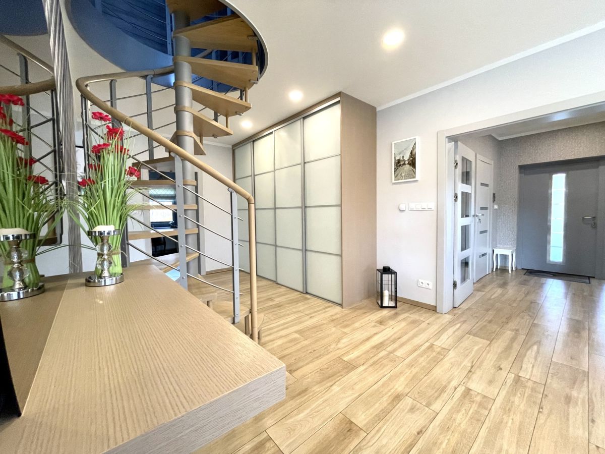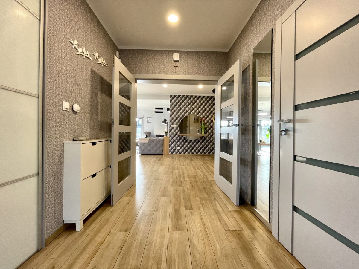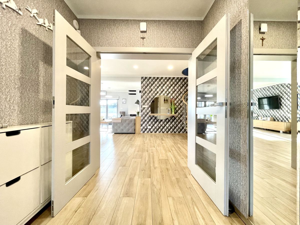 Dom ma bardzo funkcjonalny rozkład pomieszczeń, część gospodarzy znajduje się na parterze a gościnna na piętrze. W skład części gospodarzy wchodzi: kuchnia, salon, jadalnia, sypialnia główna oraz 2 sypialnie i okazała łazienka. Wchodząc przez przeszklony wiatrołap, trafiamy do eleganckiego korytarza, z którego rozpościerają się imponujące dwuskrzydłowe drzwi prowadzące do salonu. W salonie przeważają naturalne i stonowane barwy, które zostały starannie dobrane, aby nadać pomieszczeniu luksusowego charakteru. Każdy element wnętrza został zaprojektowany z dbałością o detal, tworząc spójną i designerską całość. Stylowe połączenie kolorów nadaje wnętrzu wyjątkowego uroku i elegancji.