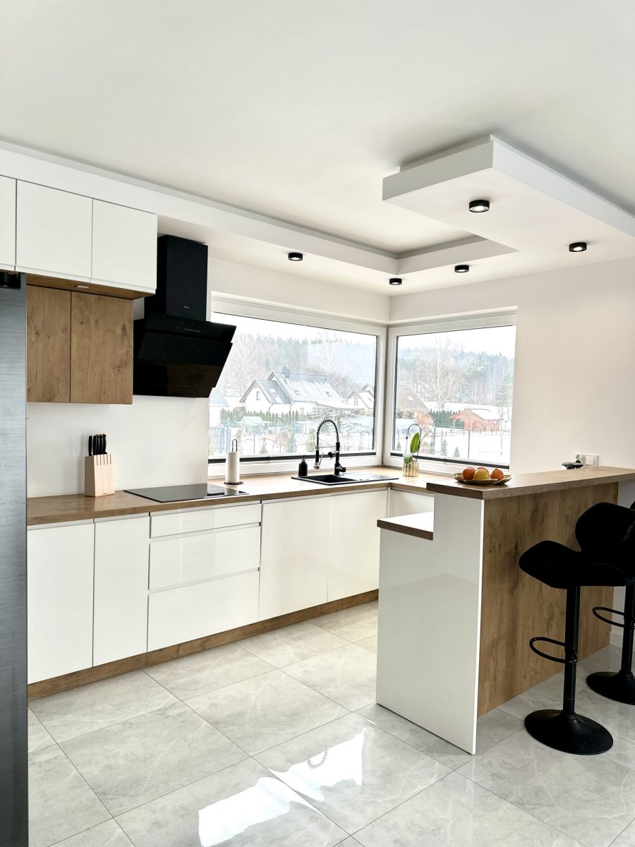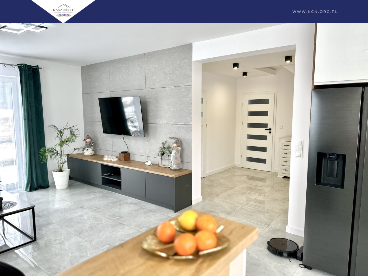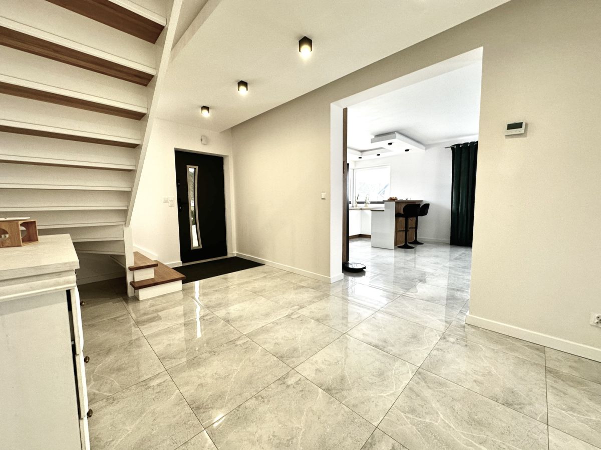 Przestronny korytarz wprowadza do serca tego domu - przestronnego salonu z otwartą kuchnią, idealnego do spędzania czasu z rodziną i przyjaciółmi.