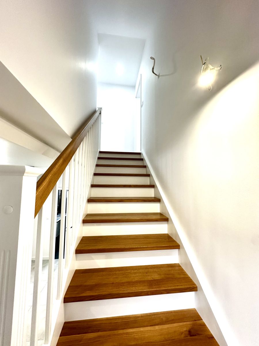 Na piętro prowadzą eleganckie dębowe schody.