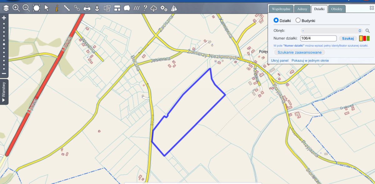 Z obecnej działki nr 106/4, w wyniku podziału geodezyjnego, powstaje kompleks 28 działek o zróżnicowanej powierzchni. Powierzchnia działki 106/4 -5,9901 ha, działka drogowa 106/3 -0,3357 ha.