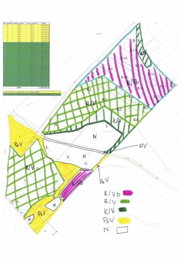 Z obecnej działki nr 106/4, w wyniku podziału geodezyjnego, powstaje kompleks 27 działek o zróżnicowanej powierzchni. Powierzchnia całej działki 106/4 -5,9966 ha,