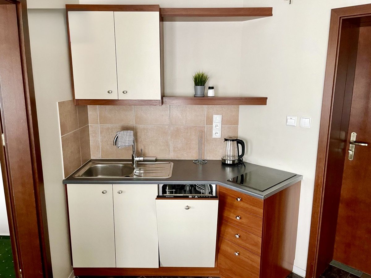 salon ( sofa, fotele, stół 4 krzesła, telewizor)z wnęką sypialnianą i aneksem kuchennym z pełnym wyposażeniem (płyta indukcyjna, zmywarka, lodowka)