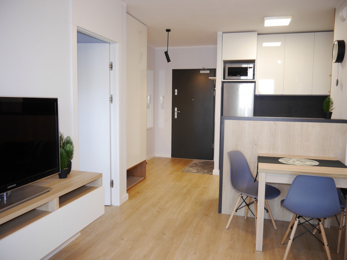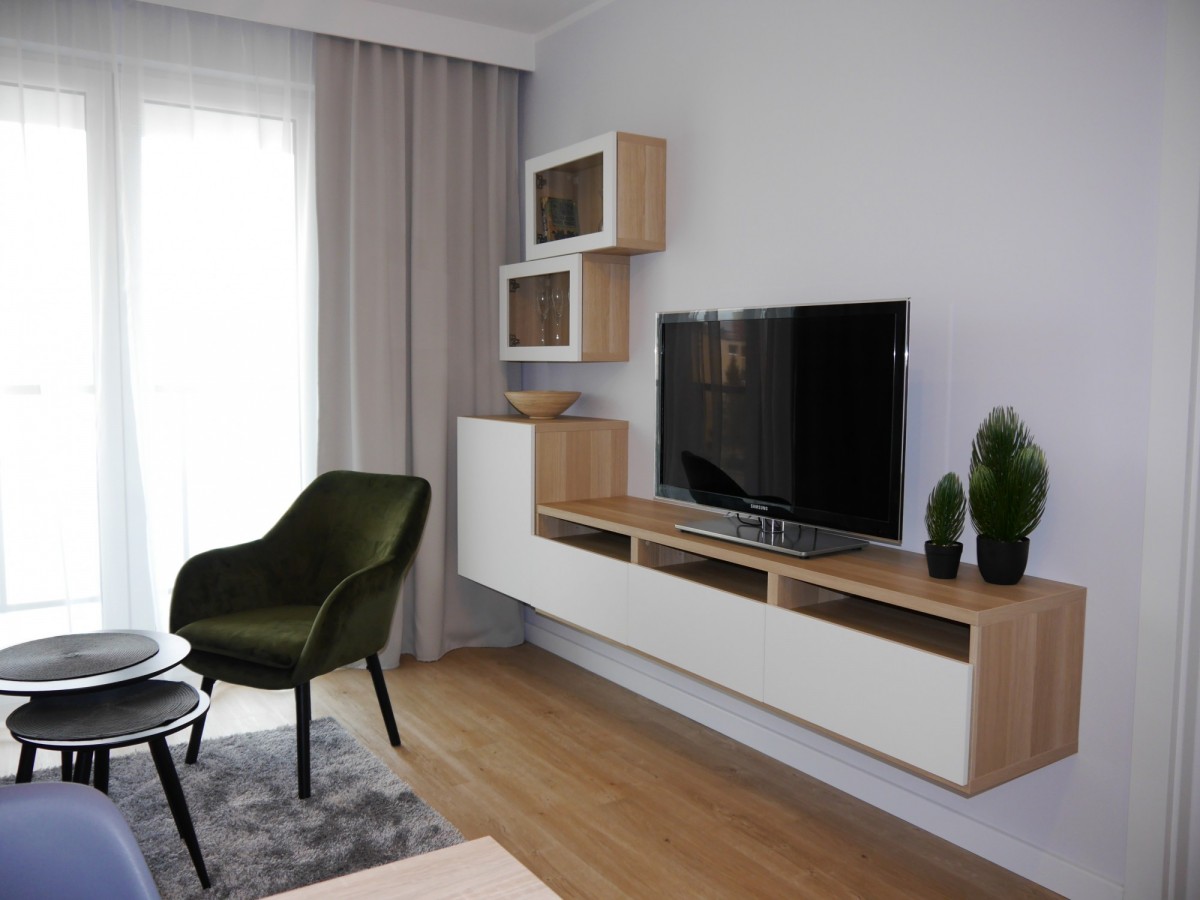 Salon: rozkładana kanapa, rozkładany stół jadalniany, szafki, telewizor, wyjście na duży balkon