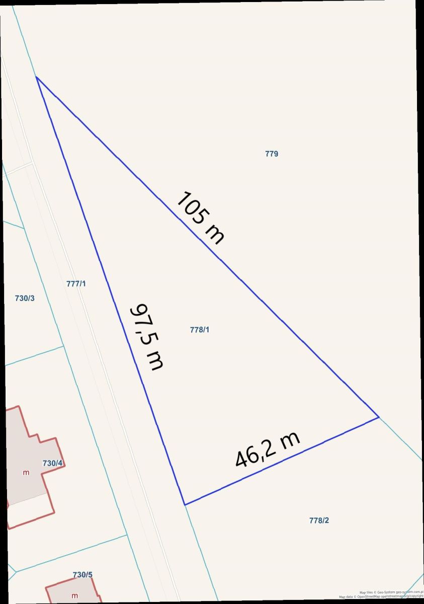 Działka nr 778/1 o powierzchni 2257 m2 działka w kształcie trójkąta